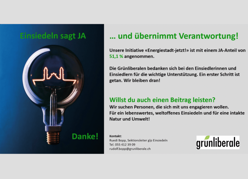 Die Einsiedler Stimmbevölkerung hat die Initiative «Energiestadt-jetzt!» der Einsiedler Grünliberalen mit einem JA Anteil von 51,1 % angenommen. Für die jüngste und kleinste Ortspartei im Klosterdorf ist das ein grosser Erfolg. Mit dem Entscheid ist nun der Weg frei für einen Energiefonds, mit dem der Bezirk Einsiedeln Private und Unternehmen, die in die Energiezukunft investieren […]